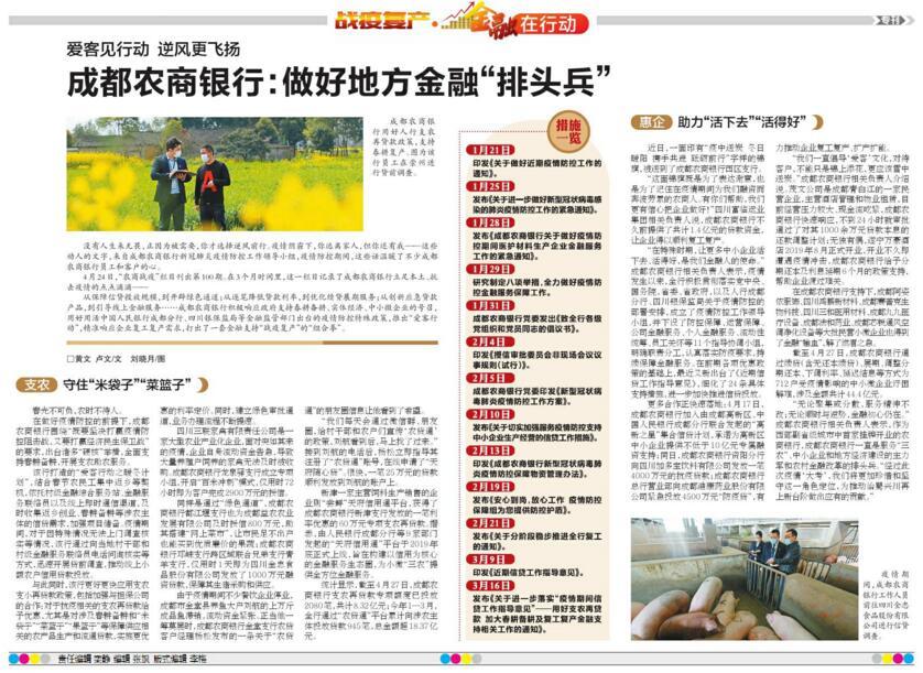 爱客见行动,逆风更飞扬。从保障信贷投放规模,到开辟绿色通道;从逐笔降低贷款利率,到优化续贷展期服务;从创新应急贷款产品,到引导线上金融服务……成都农商银行积极响应政府支持春耕备耕、实体经济、中小微企业的号召。