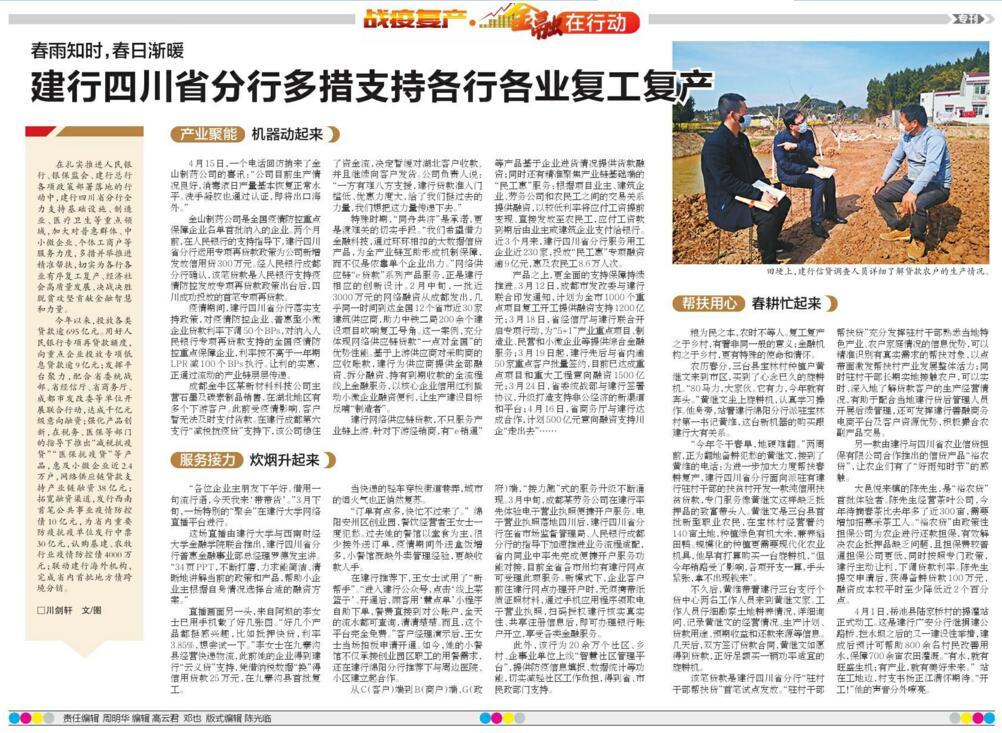 春雨知时,春日渐暖。建行四川省分行全力支持基础设施、制造业、医疗卫生等重点领域,加大对普惠群体、中小微企业、个体工商户等服务力度,多措并举推进精准帮扶,切实为各行各业有序复工复产、经济社会高质量发展、决战决胜脱贫攻坚贡献金融智慧和力量。