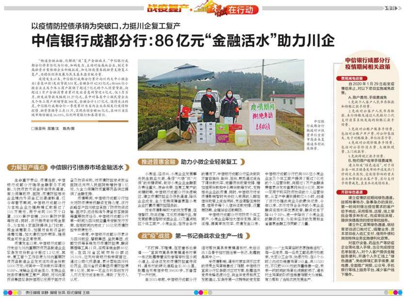 2020年4月20日——5月20日,细心的读者们注意到,《四川日报》每个工作日都会出现一期“战疫复产 金融在行动”专题,每期是不同的银行机构关于支持“战疫复产”的宣传。目前已有至少20家在川银行机构积极参与。