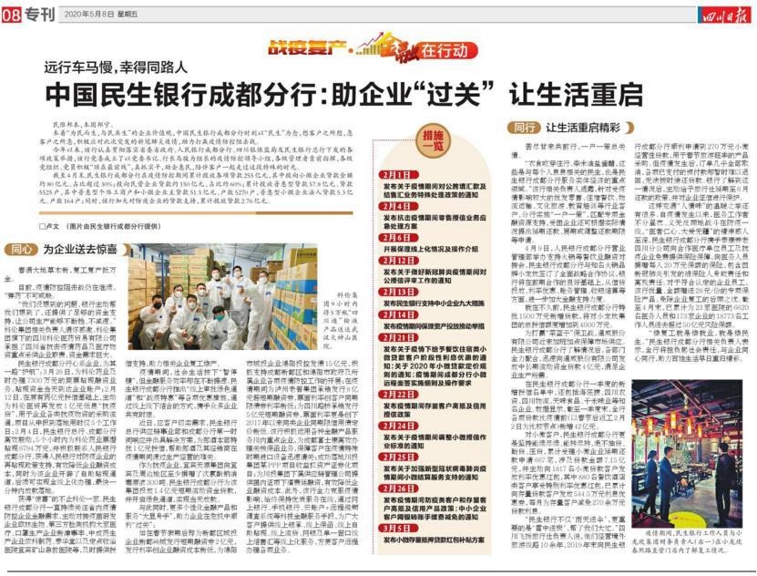 远行车马慢,幸得同路人。中国民生银行成都分行时刻以“民生”为念,想客户之所想,急客户之所急,积极应对此次突发的新冠肺炎疫情,助力打赢疫情防控阻击战。