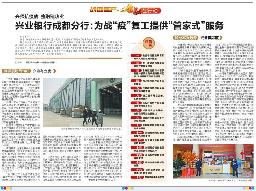 兴师抗疫病,金融建功业。兴业银行成都分行在持续加大有效金融供给的同时,强化线上支持,通过“兴业管家”等创新产品,为企业提供集资金融通、转账汇款、账户查询、银企对账、财富管理、移动办公等功能于一体的一站式综合金融服务。