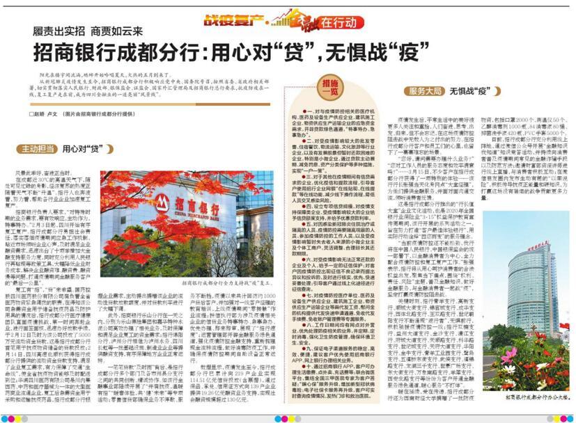 履责出实招,商贾如云来。招商银行成都分行积极响应党中央、国务院号召,按照省委、省政府相关部署,切实贯彻落实人民银行、财政部、银保监会、证监会、国家外汇管理局及招商银行总行要求,抗疫防疫在一线,复工复产走在前,成为四川金融业的一道亮丽“风景线”。