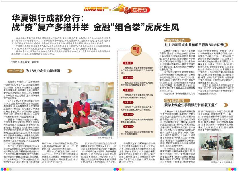 华夏银行成都分行在保证疫情防控安全的前提下,积极稳妥推进复工,目前,所有支行网点已恢复服务,该行将全力以赴,协助企业战“疫”复产,稳住经济基本盘。