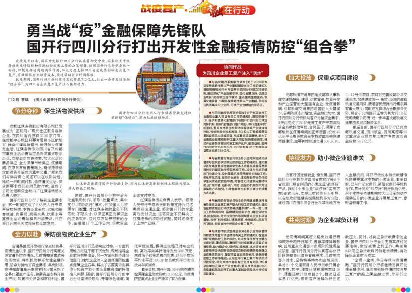 国家开发银行四川分行认真贯彻党中央、国务院关于统筹推进疫情防控和经济社会发展工作的决策部署,按照国开行总行党委统一安排,积极发挥逆周期调节作用,加大力度支持四川省受疫情影响企业复工复产,有效降低企业融资成本,快速帮助企业纾困解难。