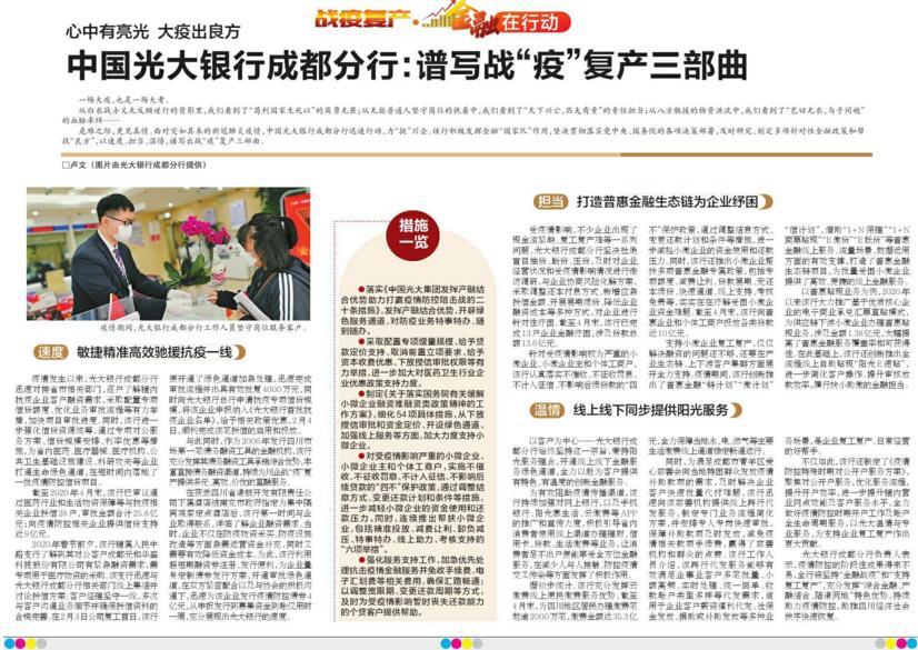 心中有亮光,大疫出良方。中国光大银行成都积极发挥金融“国家队”作用,坚决贯彻落实党中央、国务院的各项决策部署,及时研究、制定多项针对性金融政策和帮扶“良方”,以速度、担当、温情,谱写出战“疫”复产三部曲。