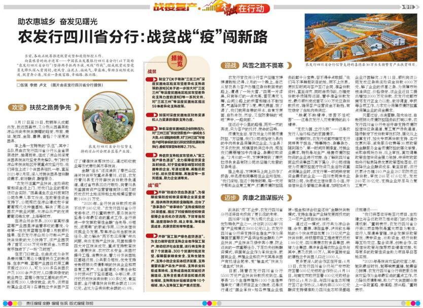 助农惠城乡,奋发见曙光。中国农业发展银行四川省分行坚持两手抓两不误、双线“作战”,组成脱贫攻坚党员先锋队深入贫困村,迎风雪、沾泥土、接地气、带露珠,帮助当地防疫抗疫、脱贫奔小康,闯出一条致富路、幸福路、振兴路。