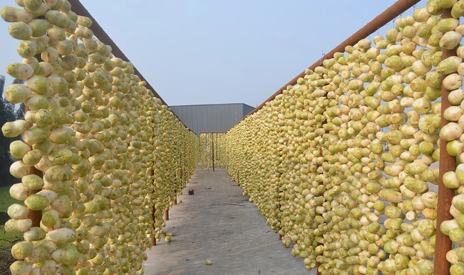 红萝卜通过腌制、酱渍、制干,不到尺长的红萝卜,经过交错滚到切,晾晒出一展臂长短,网眼大小均匀。后来经过进一步加工,将红萝卜切成像蓑衣黄瓜一样的蓑衣红萝卜,再搭到竹竿上晾晒,晾晒过程中,整根红萝卜身躯越来越长,如万千游龙翻腾。加工晾干后,不容易坏,运输轻松,大大解决销售问题,同时正是因为其独特的滋味,萝卜龙也成了自贡宴席上不可或缺的一款佐食小菜。