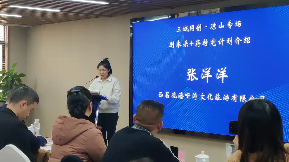 现场,凉山文旅集团西昌观海听涛文化旅游有限公司代表张洋洋介绍了西昌专场和剧本杀+听涛谷-蒋特宅景区相关情况,将以剧本杀等新型沉浸式文旅业态围绕主题酒店、特色餐饮、实景体验、民国服饰、影视基地等内容赋能,将该景区打造成全国独具特色的多元化、专业化“沉浸式体验基地”。