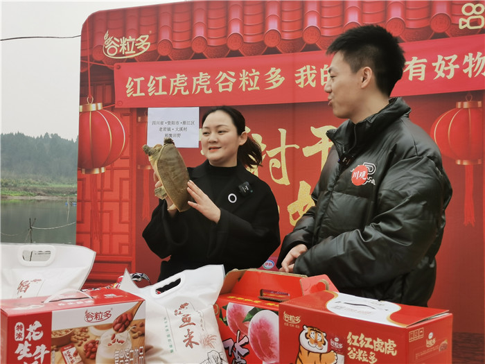 直播场地设置在大溪村稻鳖田附近,汁多甜美的沃柑、饱满Q弹的稻鳖米等琳琅满目的农产品摆放在台上。“我们这里有号称‘马尔代夫’的水龙灵温泉度假村,已勘探出了温泉,目前正在洗井,有望明年邀请大家来泡温泉。”直播中,老君镇党委副书记、镇长胡明香介绍了当地好吃好玩的项目,谈到产业发展时,胡明香手举一只肥美的稻鳖,对着镜头展示起来。