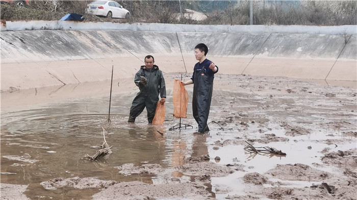 远处稻鳖田里,师傅一手拿钢叉、一手提网袋正在寻找稻鳖,钢叉敲一敲,手伸进田地一抠,举起手来便多了一只被稀泥包裹的稻鳖。主播跃跃欲试也穿上防水背带服,挽起衣袖,踩进了软绵绵的田里。“每一步都走得很艰难,整个人都陷在里面,”有趣的捉鳖环节让正在观看直播的网友们忍俊不禁。