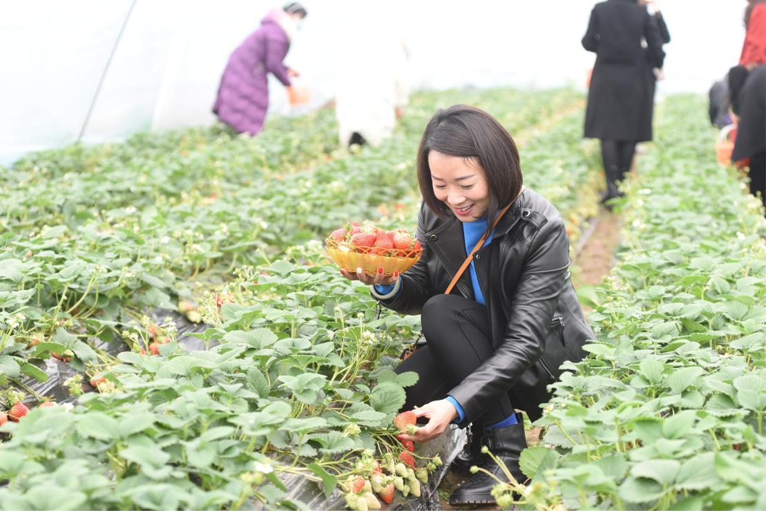 线上火爆,线下也闹热。在草莓采摘游启动仪式暨“新春送福”迎新春现场,丰富多彩的文艺节目渐次呈现,送福送春联暖心接力;在农产品展示上,借草莓之光,当地农副特色产品纷纷登场;在草莓采摘体验现场,游客们拉开架势,你采我摘。采摘游线上线下全方位联动,吸引了众多游客参与。从成都市区来的曾女士说,这里的草莓真的巴适,好多朋友在朋友圈看到我来这里,都让我帮他们买点回去。