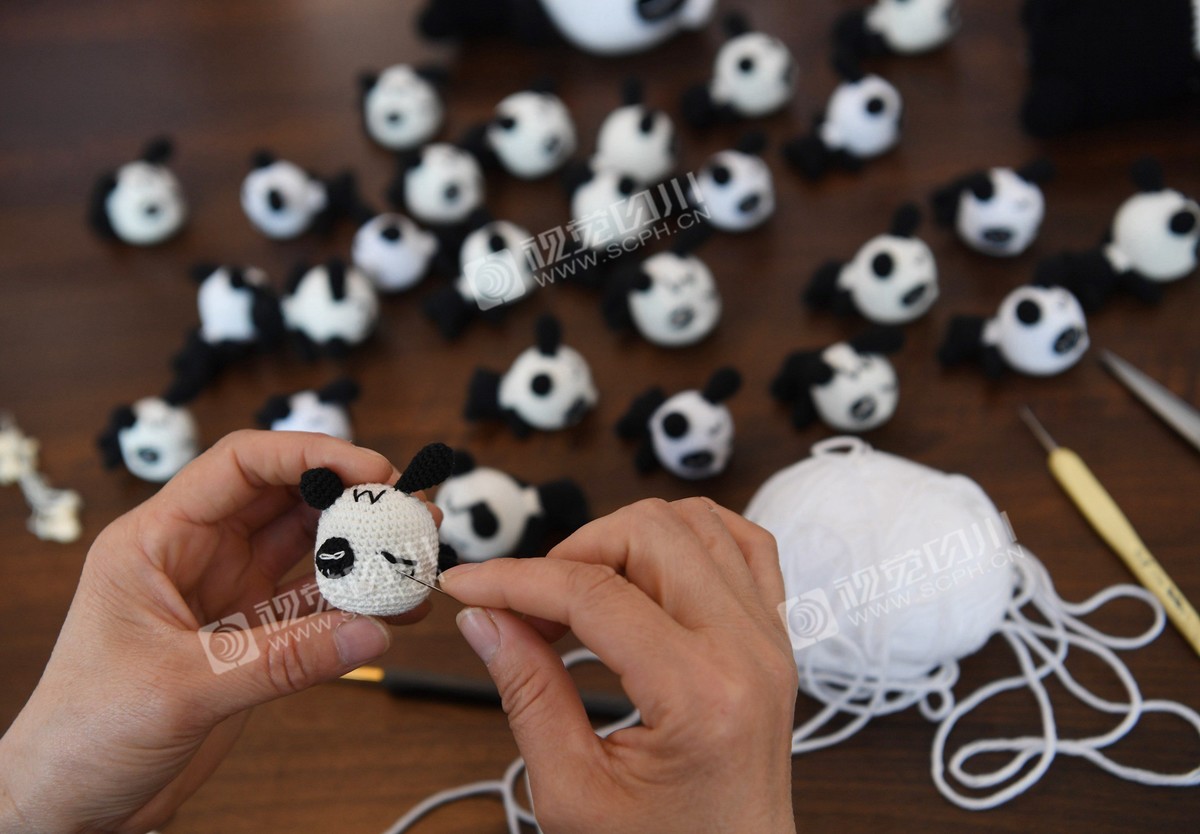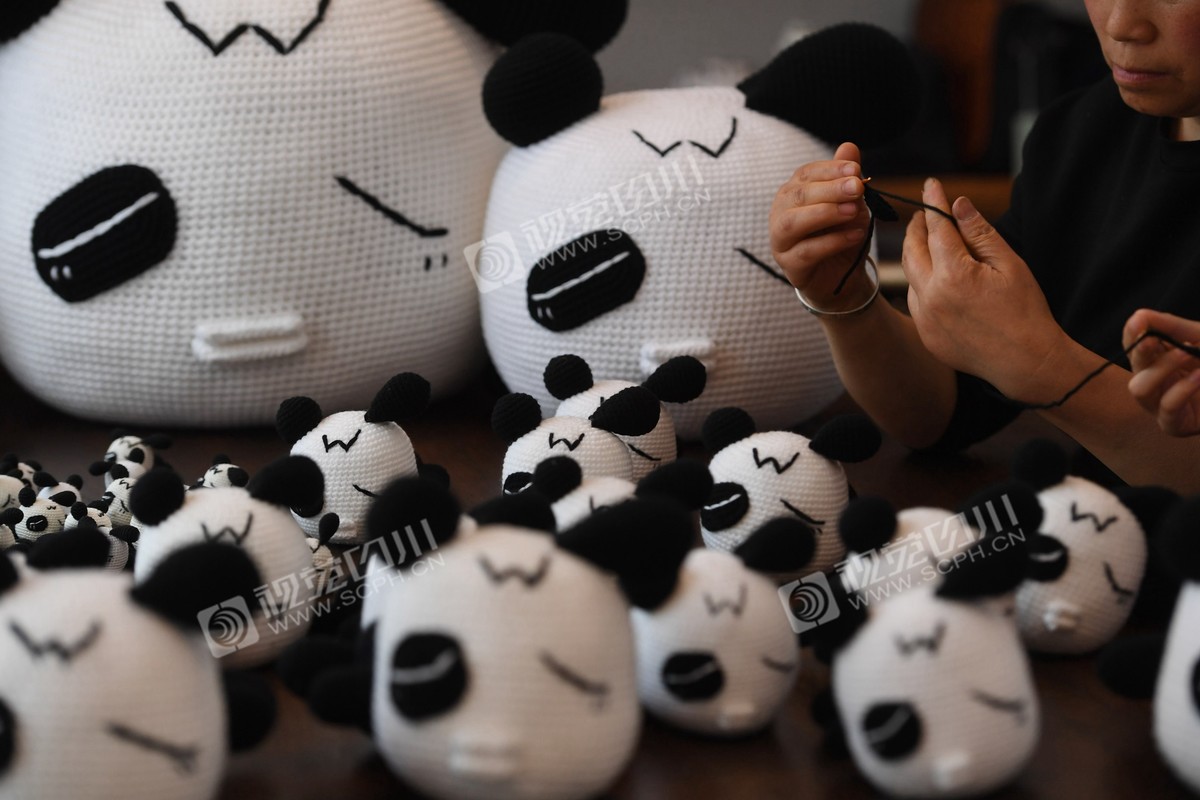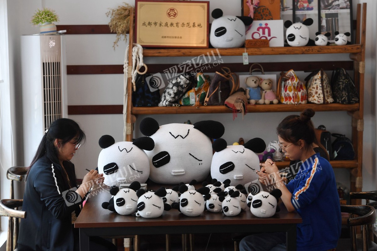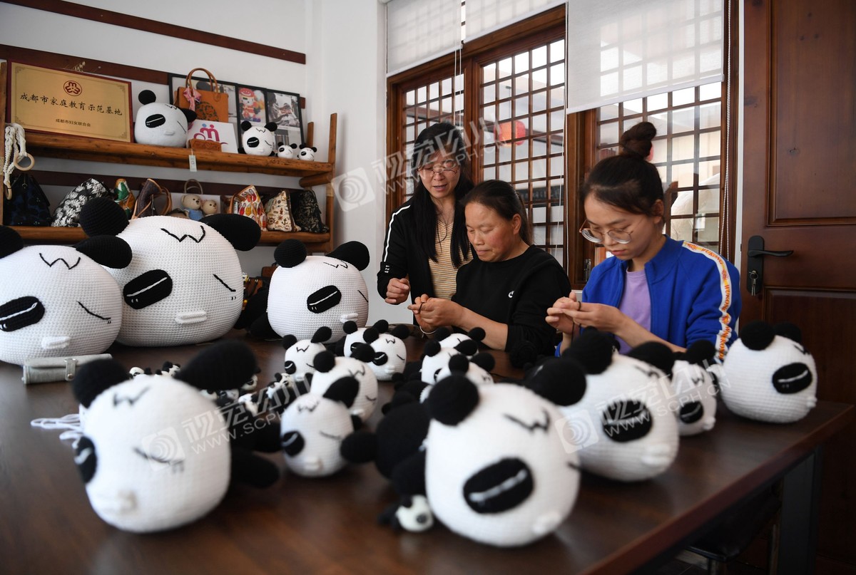 5月25日,成都市温江区寿安镇岷江村妇女居家灵活就业基地——“指尖的爱”生活馆里,来自该村的十余名妇女围坐在一起赶制着一批熊猫玩具公仔——“凫猫”。