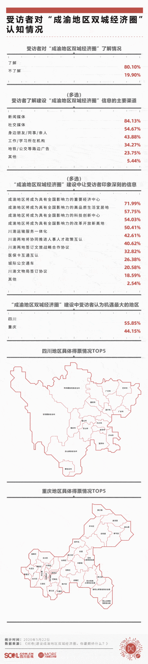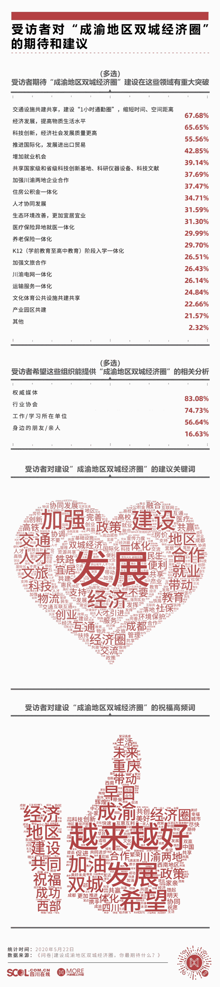 此次调查自2020年5月17日开始,截至5月24日,川渝两地有13万网友参与话题讨论、转发和问卷填写。尤其在被问及对“成渝地区双城经济圈”建设的“期待”和“建议”等开放性问题时,不少网友逐字输入、认真回复,有效表达自己建议,从而提升了此次调查的参考价值。