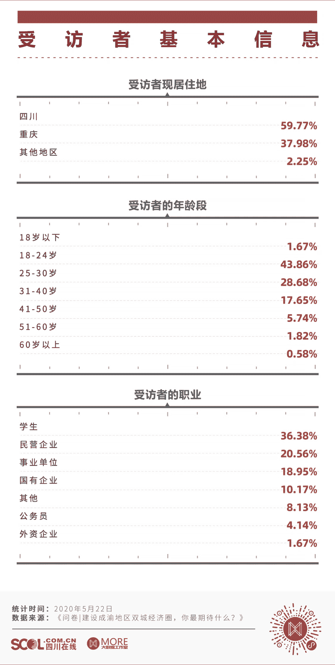 本次调查的受访者主要来自四川和重庆,其中四川受访者占比59.77%,重庆受访者占比37.98%。受访者年龄主要集中在18岁到30岁之间,占比超七成,其中18-24岁受访者占比为43.86%,25-30岁受访者占比为28.68%。
