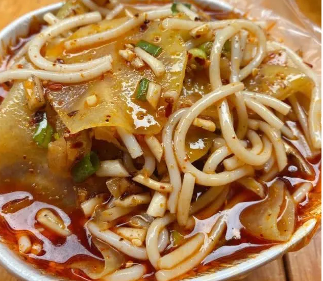 半碗土豆片、半碗米线,调上味精、孜然、酸甜醋、秘制酱油、大头菜、葱、折耳根等调料,最后淋上一勺厚厚的辣椒油,淡黄的土豆片、白生生的米线,鲜红油量的油辣子,搭配在一起,好看得让人口水流起八尺长。