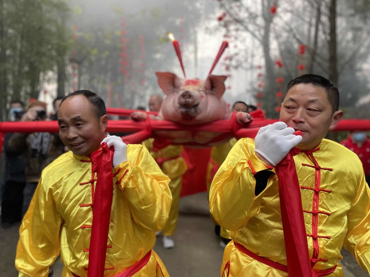 这是1月16日,蒲江县甘溪镇箭塔村非遗年猪祭民俗文化活动的现场,用村民的话说,是“恭送天蓬元帅回天庭复命”的节日。这个传承千年的传统曾一度失传,2017年起箭塔村再度挖掘其背后价值,重新启动年猪祭,到如今已是第六届。
