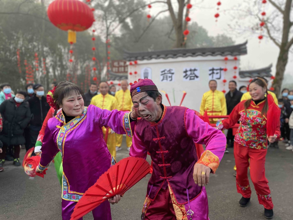 1月16日的年猪祭上,祭祀游行队伍绕着村道缓缓前进,先后经过刚刚开市的乡村集市“箭塔闹子”、被当地人称为“蛮塔子”的千年古佛塔、年猪祭广场。队伍里幺妹灯表演队演员夸张的肢体语言和表情,逗得随行的孩子们哈哈大笑、前仰后合,吸引越来越多的人走一路看一路。