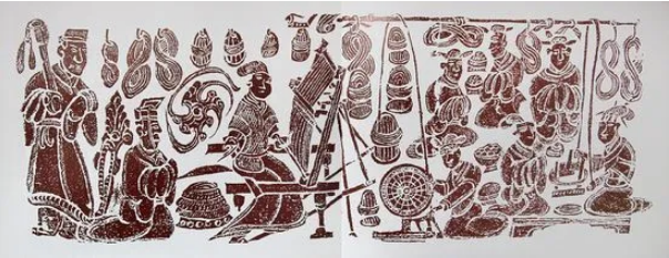 汉画像石《薄太后输织室》。薄太后刚刚被俘虏到刘邦后宫的时候,是一名光荣的纺织女工。