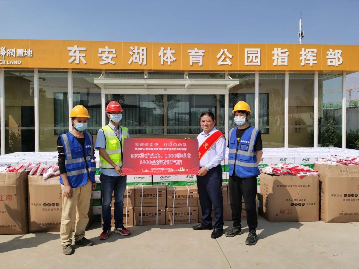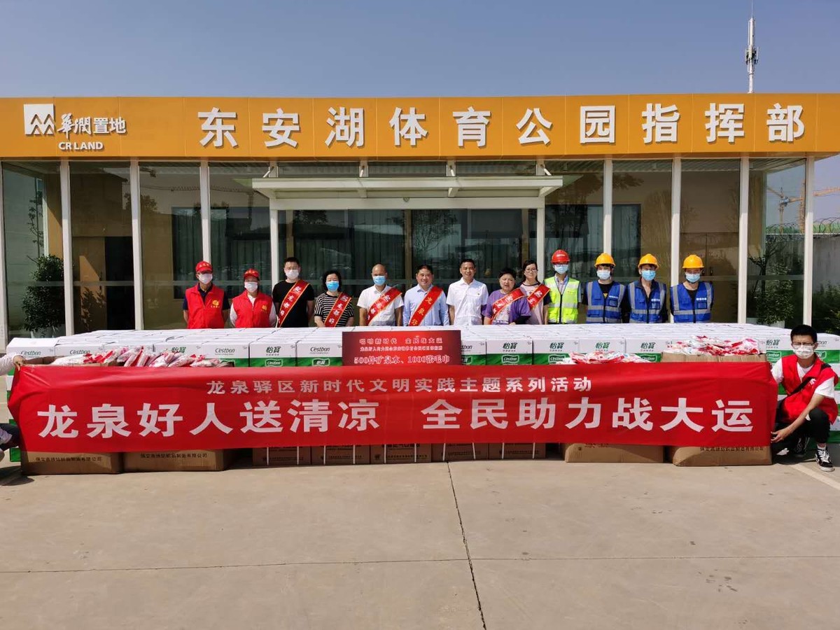 龙泉好人、龙都社区好人志愿服务队队长赵纯德带领8名社区好人,现场为大运会东安湖体育公园项目部赠送了500件矿泉水、1000张毛巾和1200盒藿香正气液,衷心感谢建筑工人们的辛勤劳动。