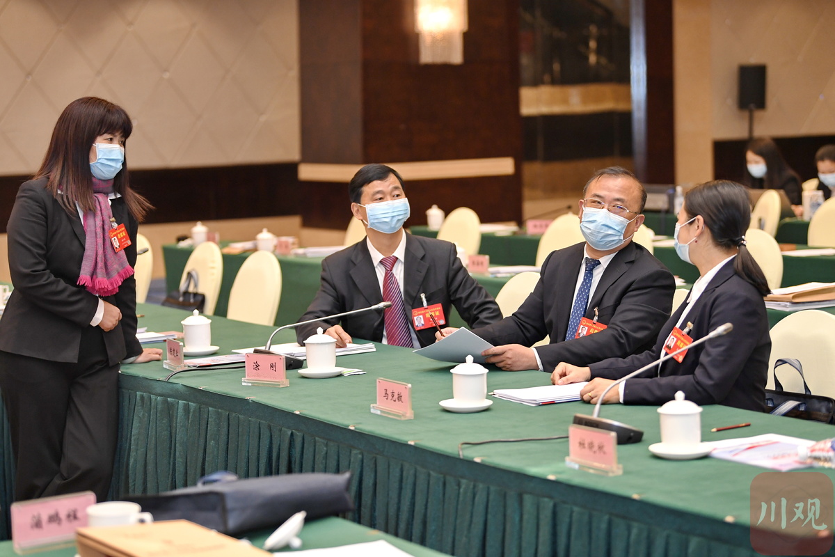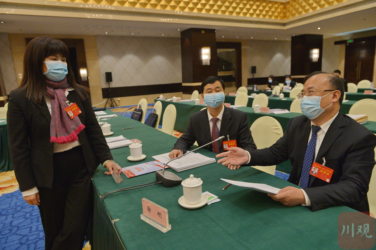 1月18日,小组讨论结束后,涂刚代表(右一)与教育系统的几位代表进一步交流履职心得。