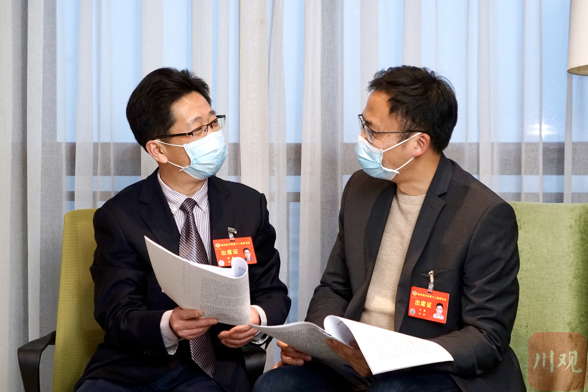1月19日,陈彬委员(左)与李涵委员探讨“双碳”人才培养问题。