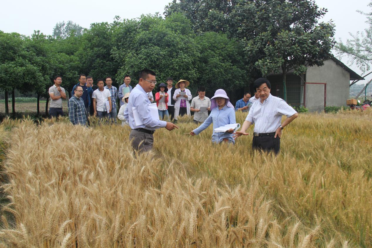 首席专家郑有良教授在田间指导青年科技人员进行品种选择。
