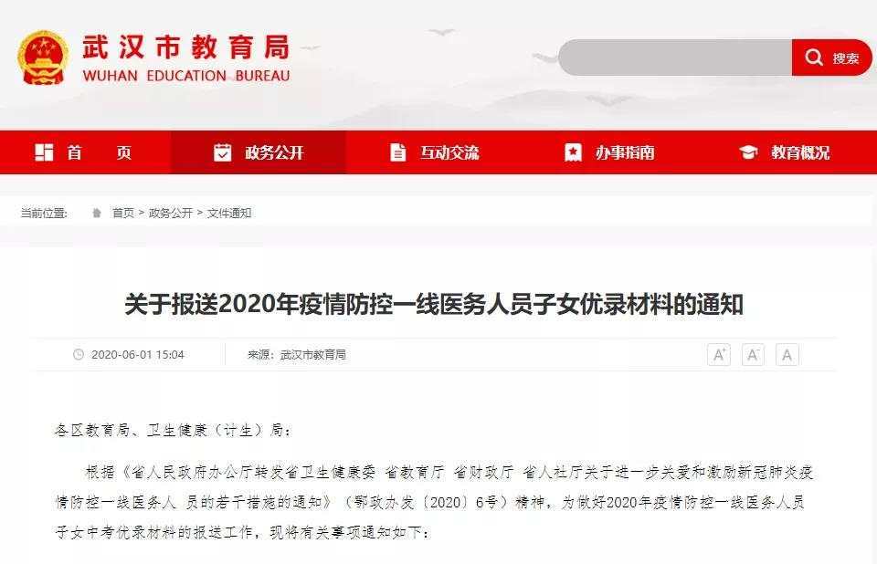 近日,武汉市教育局公布今年中招政策时明确,武汉将对2020年参加中考的一线医务人员子女,在其考试成绩总分基础上加10分后参加录取,实行计划单列。6月1日,申报该项优录的详细政策公布,进一步明确申报对象和申报流程。