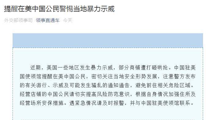 中国驻美使领馆提醒在美中国公民警惕当地暴力示威。