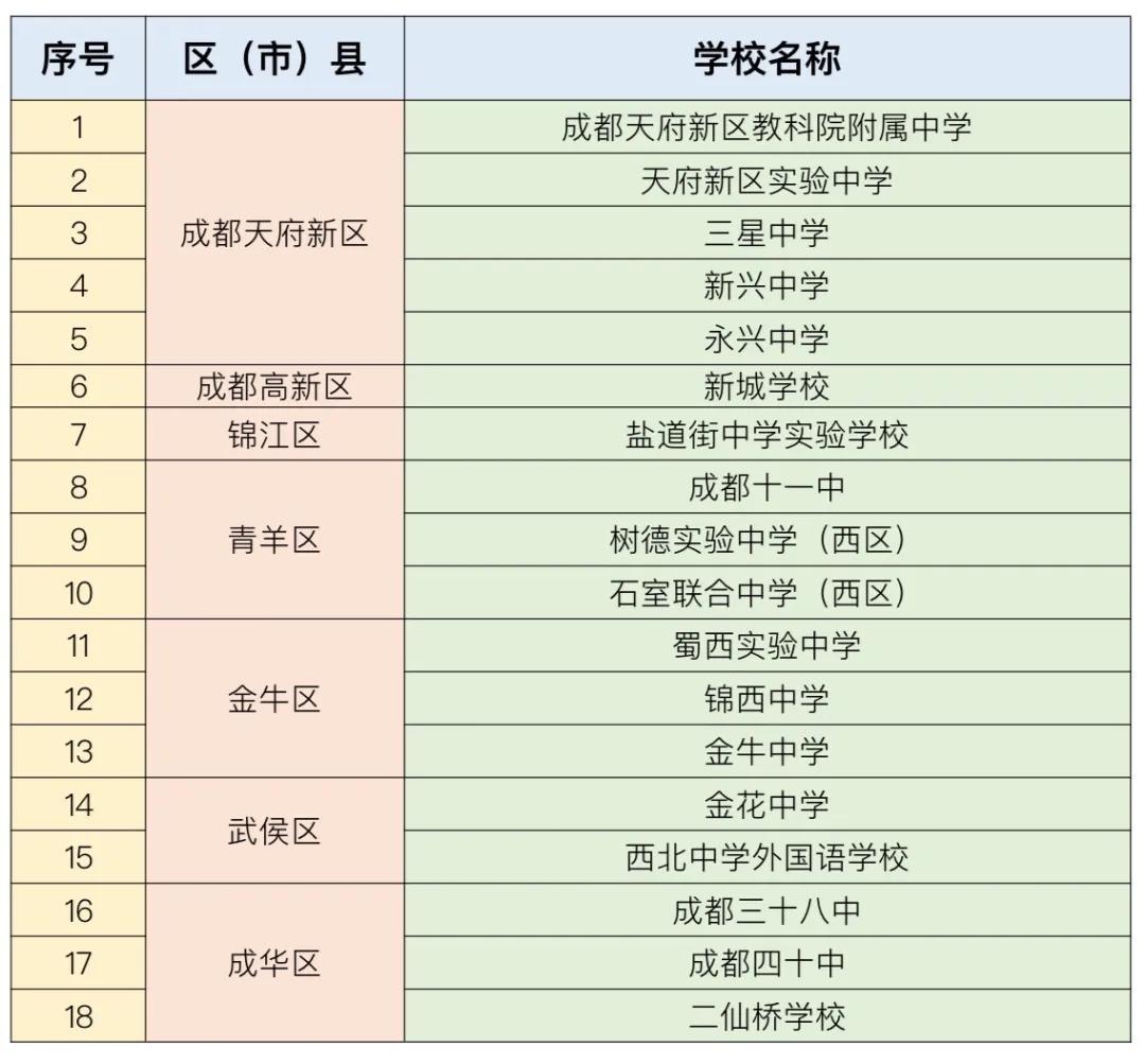 2019年,成都市教育局印发《成都市公办初中强校工程实施方案》,公布了67所公办初中强校工程实验校名单(附后),明确提出:今后3-5年,市、区(市)县两级教育行政部门将通过政策倾斜扶持、名校支持带动、名师专业引领、专家全程指导、深化教学改革、优化资源配置等,激发实验校发展内生动力,培育一批“家门口的好学校”,更好地满足市民对优质公办初中教育的需求。