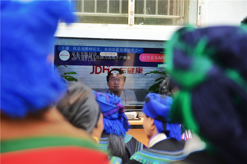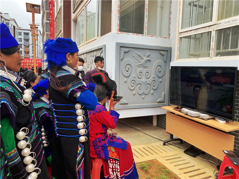 6月2日下午,四川凉山州金阳县易地扶贫搬迁,有“千户彝寨”之称的马依足乡东山社区集中安置点举行分房活动,金阳县14个高山乡镇的6582人搬迁至这里居住。搬入新居后,不少村民被现场的一台视频演讲吸引了,来自京东健康全职医生、中华中西医结合血液学分会委员刘雅峰,通过4G远程医疗技术,就当地群众关心的疾病进行了视频问诊。