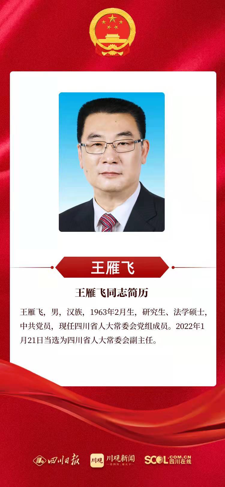 在1月21日下午举行的四川省十三届人大五次会议第三次全体会议上,王雁飞、邓勇、刘坪、何延政当选为四川省第十三届人民代表大会常务委员会副主任。