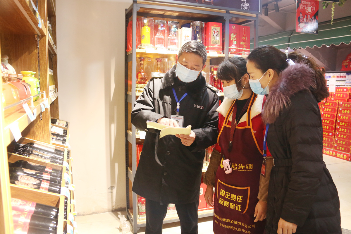 宜宾市叙州区纪委监委紧盯节点对大型商超、名贵烟酒店开展作风建设监督检查,着力查纠“四风”隐形变异。图为2021年12月18日,该区纪检监察干部在超市查看是否有单位违规购买名烟名酒情况。罗艳 摄