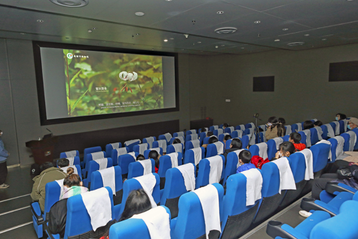 1月21日,成都博物馆内,一场“西部花卉王国”观影活动,吸引了30位小朋友及家长参与,他们正在观看的是成都市植物园和“西南山地”公益组织共同制作的科普短片《西部花卉王国》。