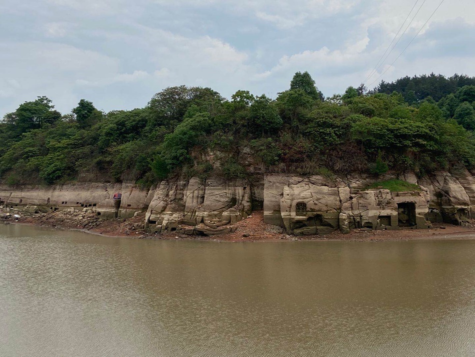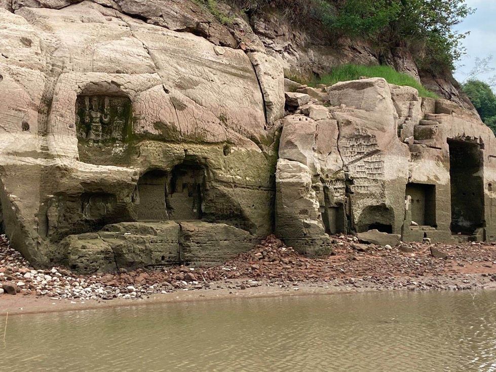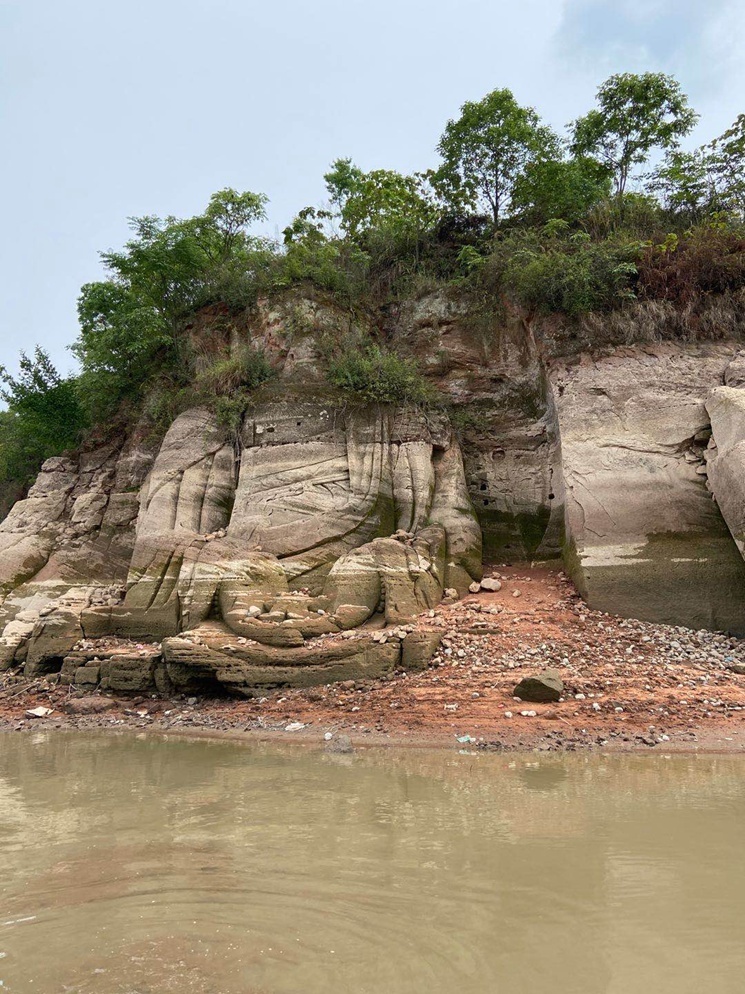 这批石刻造像,被鉴定为唐代所刻。如今水库水位下降,可以看到它们和大佛一起,分布在长450米、高26米的崖壁上。多年来的风化水蚀,多数石刻已经渐渐模糊,唯有清代知县题词的“乐善不倦”雕刻在崖壁上还清晰可见。不过,徐成村的印象中,这片石刻曾经异常精彩,“大佛周边雕刻的15龛造像,共有195尊。人物众多,姿态各异,栩栩如生。”这些雕刻所体现出来的精湛石刻技艺,给徐成村留下深刻印象。因此黑龙滩水库建成以后,他还曾多次带着朋友前往踏访。“可惜只有在天气晴朗、湖水清澈时,才隐约可见水底下佛衣波动,像今年这样几乎露出全部身体的情况还十分少见。”