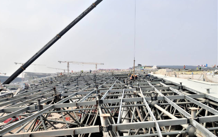 据承建方中建八局项目经理詹进生介绍,T1航站楼屋面工程总面积16万平方米,分为11个结构层,目前正在进行的是屋面板安装,整个屋面工程已完成75%并实现了全部断水,预计7月底,屋面施工将全部完成。