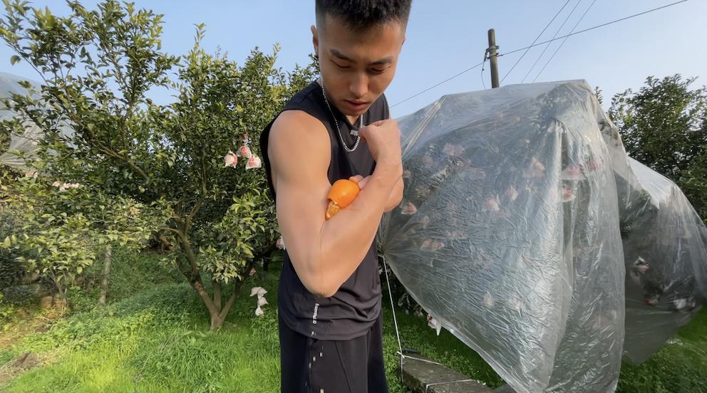 身高185cm的杜川,常常穿着棒球服外套、运动卫衣,虽然身在果园,手里忙着农活,可在他身上却没有一点“乡土气”,取而代之的是感染力十足的明朗笑容和干净利落的健身动作。