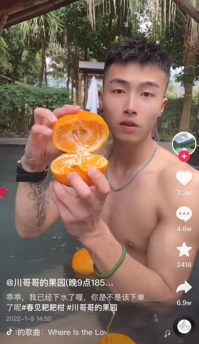 “川哥哥的果园”,原名杜川,1998年生,成都市蒲江县西来镇石桥村的一名果农,短视频博主。2021年8月更新了短视频平台的第一个作品,2021年底因在耙耙柑介绍中加入了健身日常、与粉丝亲切互动等元素,短期内涨粉近30万,平均单条视频播放量超百万,一跃成为带货类短视频的热门博主,带火当地耙耙柑销售,每日发货量超1000件。