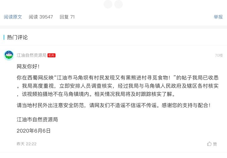 对此,当天22点,江油市自然资源局给出官方回应称:经过我局与马角镇人民政府及辖区各村核实,该视频拍摄地不在马角镇境内。相关情况我局将及时跟踪核实了解。同时提醒当地村民外出注意安全防范,也请网友们不造谣不信谣不传谣。