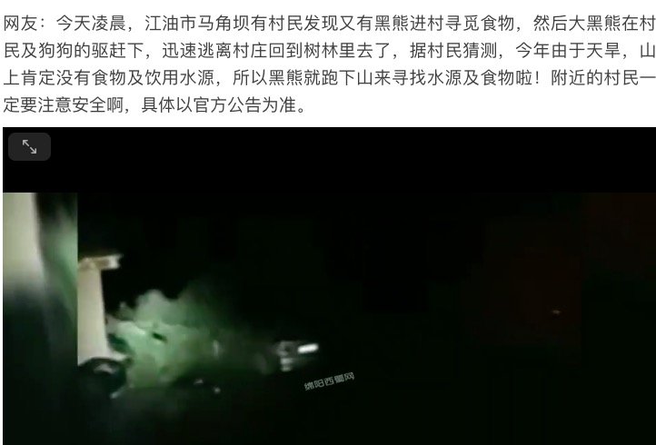 6月6日,有网友在网络论坛发帖称:江油市马角坝有村民发现又有黑熊进村寻觅食物,然后大黑熊在村民及狗狗的驱赶下,迅速逃离村庄回到树林里去了,据村民猜测,今年由于天旱,山上肯定没有食物及饮用水源,所以黑熊就跑下山来寻找水源及食物啦。