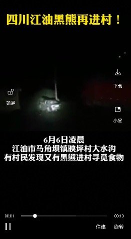 同时还配发了一段视频。视频内容为在黑夜中,在手电筒光照射下,一支疑似黑熊的动物从汽车旁经过,背景声音中可以听到狗叫,以及疑似川渝贵口音的对话。