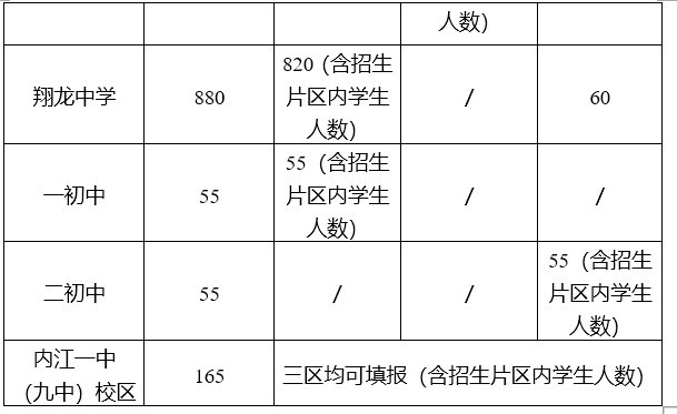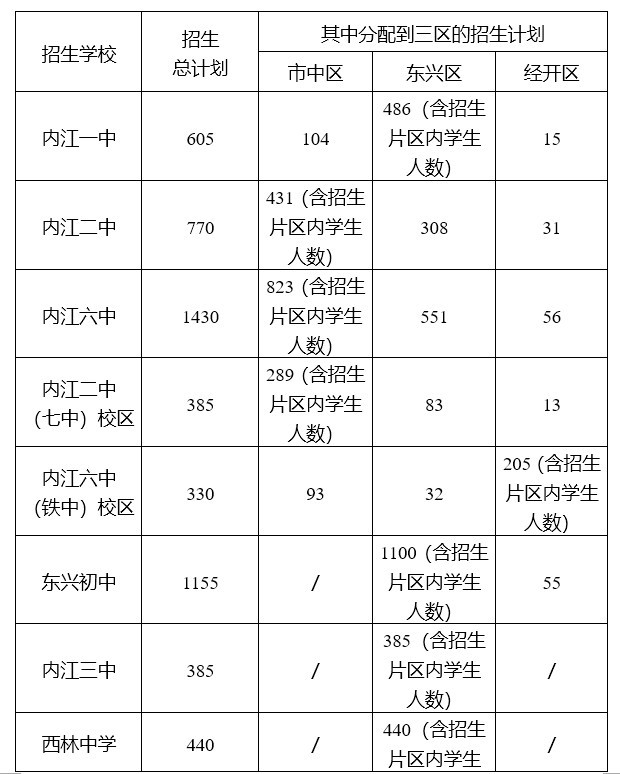 根据《2020年内江市主城区小升初招生工作方案》和相关文件精神,结合三区小升初招生人数和初中招生学校实际,确保所有符合条件的适龄儿童少年均有一个公办学位,按照属地管理和统筹兼顾原则,现将2020年内江市主城区小升初招生计划下达如下(见下表),请认真遵照执行。