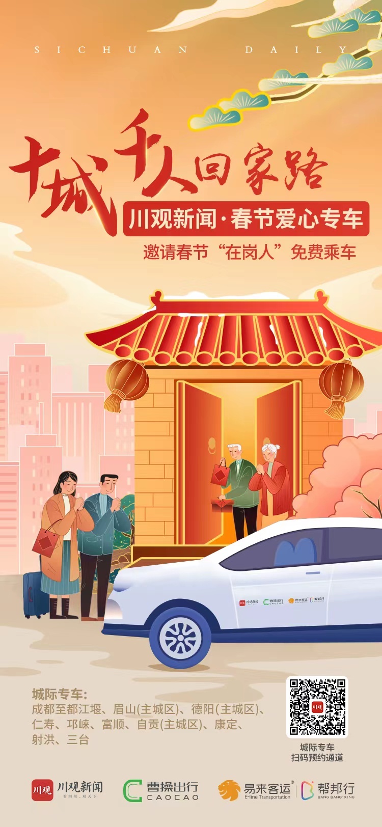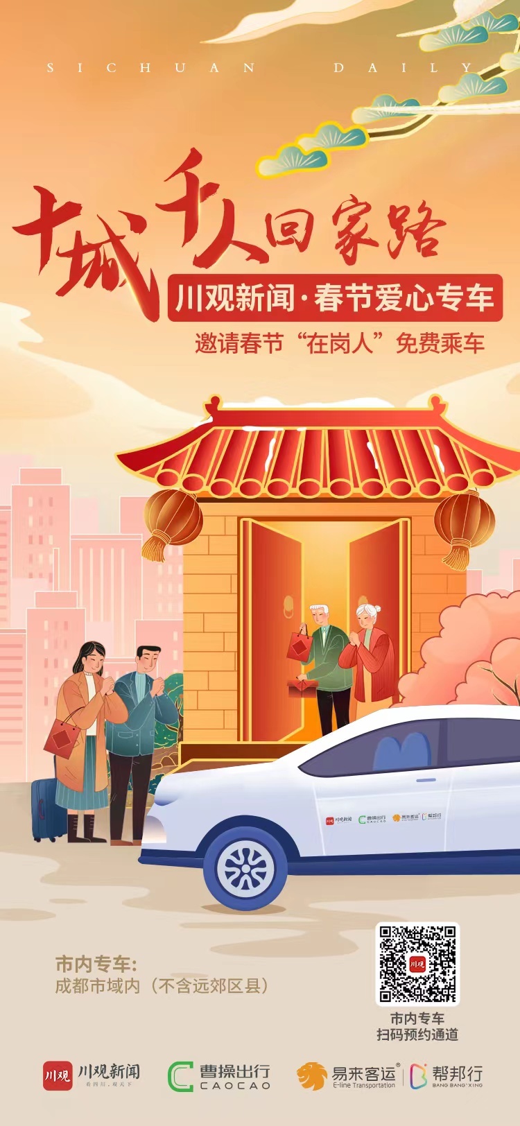 2022年1月25日17时至2022年2月6日18时,提供成都市指定范围内24小时出行以及城际专车间次免费预约服务。曹操专车平台及易来客运·帮邦行出行平台将免费接送在岗人,共同营造安逸祥和的美好生活节庆氛围。