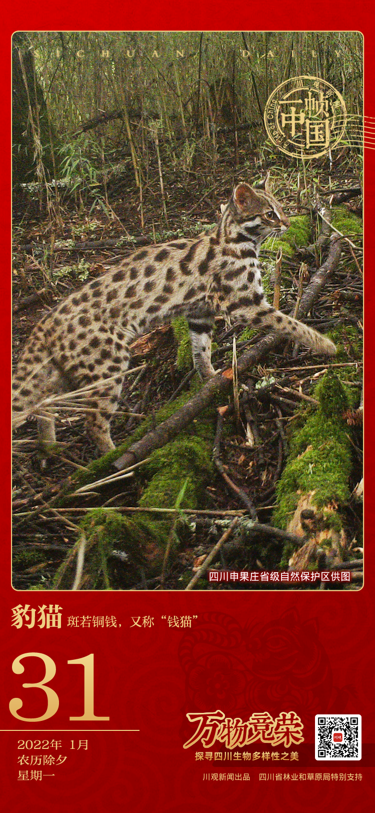 虽然近几十年来,四川范围内没有野生老虎的分布记录,但是野生“小虎”——猫,却常常在红外相机中出现。迎接虎年,恭贺新春,从今天开始,天府自然历将推出“虎年说猫”系列,陆续介绍一批在四川分布的野生猫科动物,希望这些可爱的“小虎”能给您带来好运。