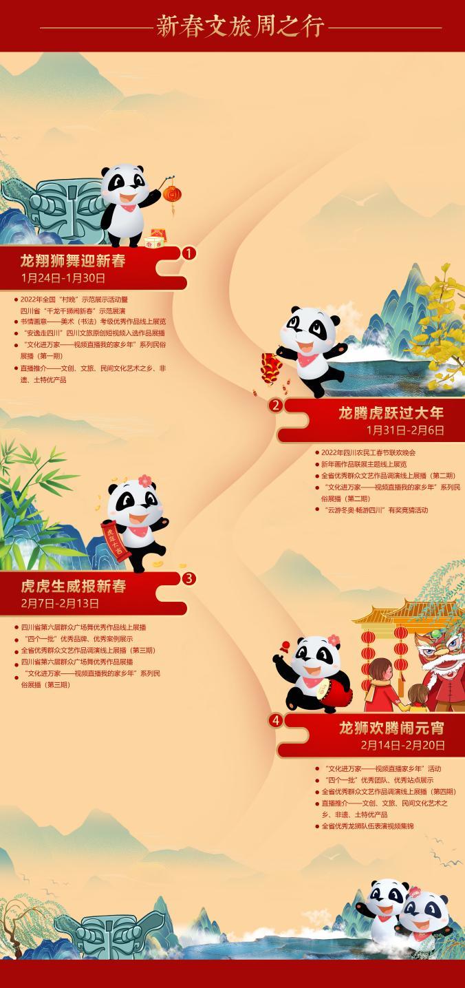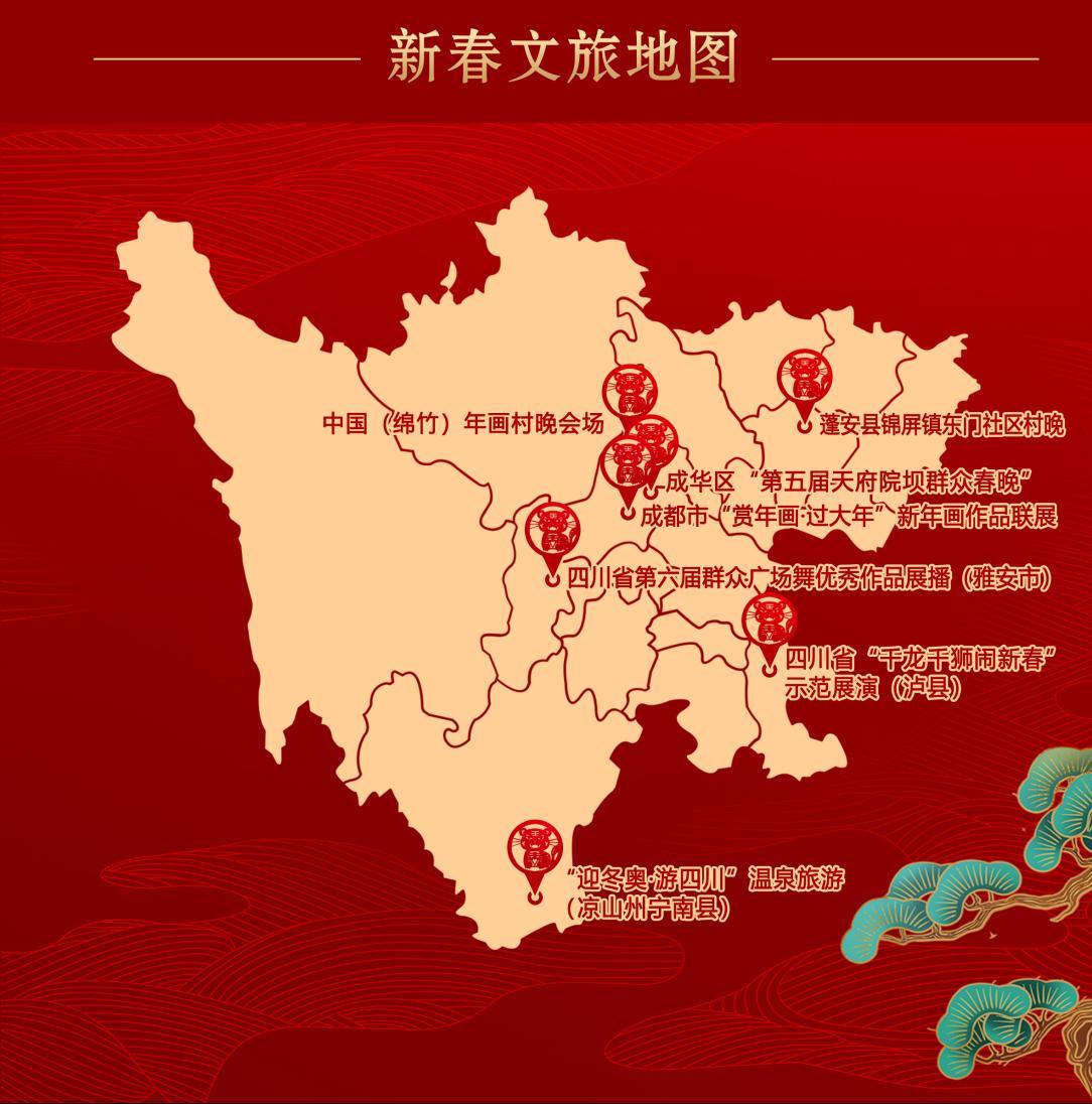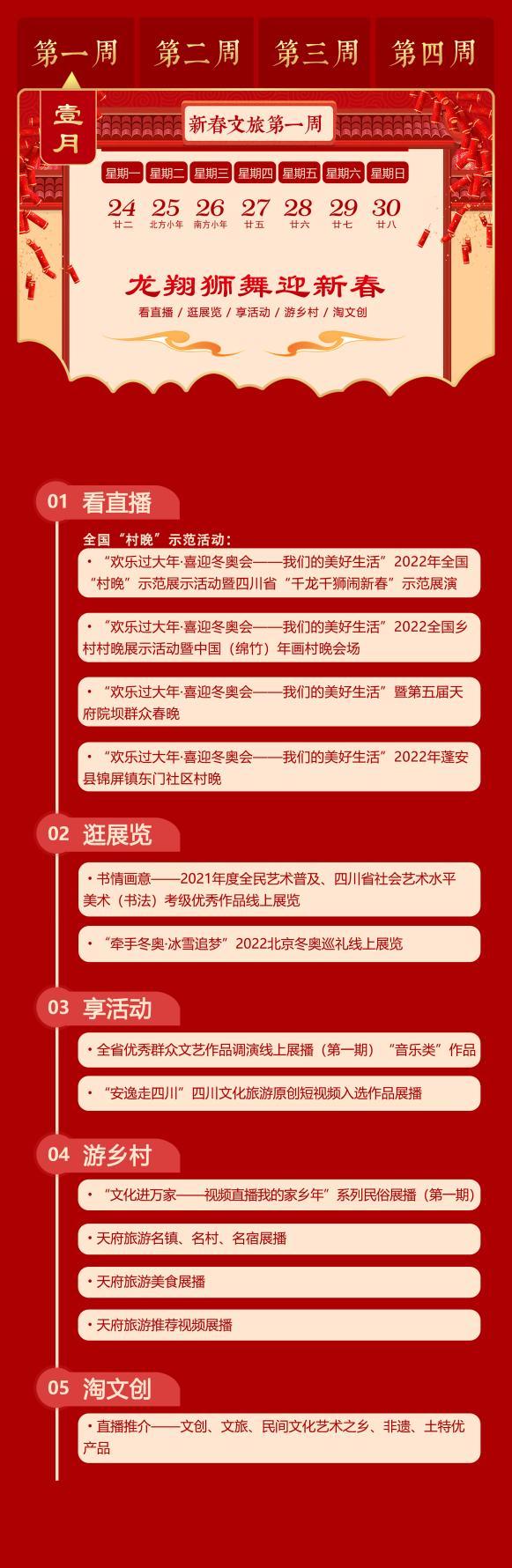 此外,还有“看直播”“逛展览”“享活动”等板块,为群众提供多样文化选择。其中,“享活动”“游乡村”板块,将联袂呈现锦绣天府歌盛世的新春贺岁图,带群众领略民间文化艺术之乡的魅力。