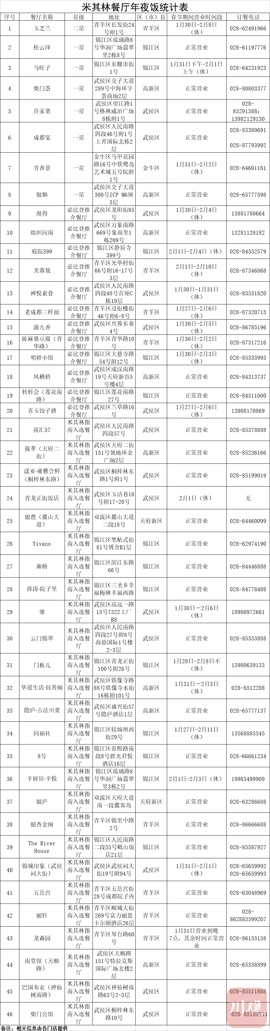 “我们还出版了《成都美食简明攻略》,各大书店有售。每道菜都有制作方法讲解视频,市民朋友在家就能跟着川菜大师学做名菜,享受做年夜饭的乐趣。这些视频在成都市商务局官微也可观看。”该负责人介绍,另一方面,米其林已正式发布了首版(2022年)成都米其林指南,包括1家二星餐厅,8家一星餐厅,13家必比登推介餐厅和28家米其林指南入选餐厅,成都成为继北京、上海、广州后中国内地第四个拥有米其林餐厅的城市。此外,美团“黑珍珠餐厅”和大众点评“必吃榜”餐厅的质量也很高,肯德基、必胜客等快餐、简餐企业也有丰富的选择,满足市民的多元需求。“这个春节,大家可以利用闲暇时光,去这些餐厅打卡。”