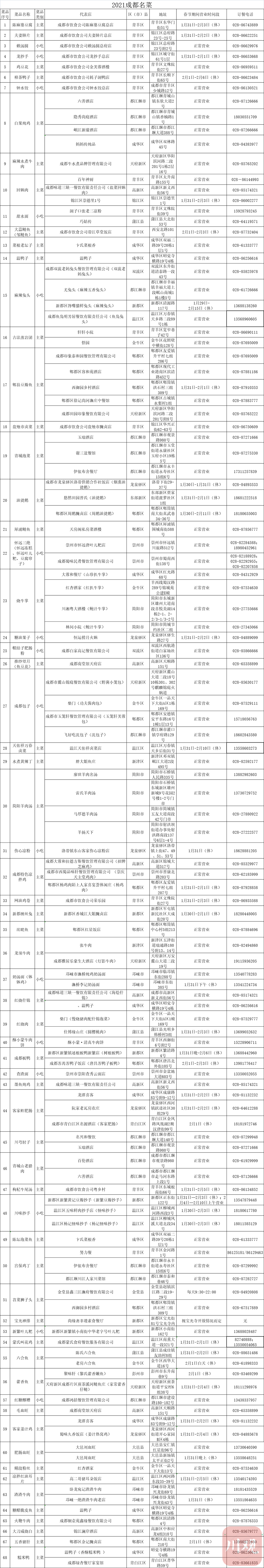 在做好疫情防控的前提下,为了保障市民度过一个欢乐祥和的虎年春节,1月25日,成都市商务局发布2022虎年年夜饭指南,结合春节期间市民消费需求,聚焦成都名菜,推出300家成都餐饮名店清单以及订餐信息,鼓励广大市民网上订餐、预约就餐、错峰用餐,倡导餐饮门店和平台提供送餐上门服务,让市民在家也能享受“舌尖上的美味”。
