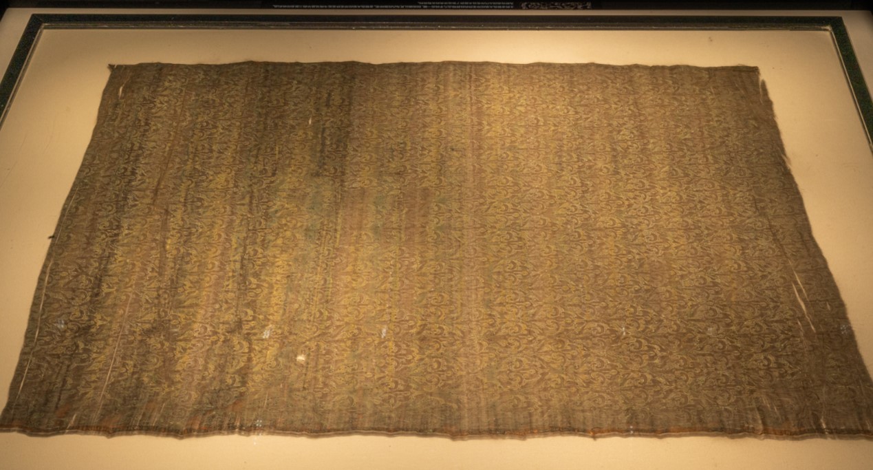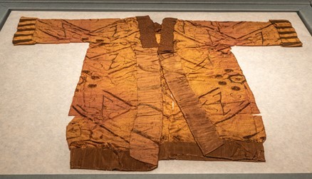 前秦紫缬襦,扎染缬点呈方形,均匀平铺,错落有序;袖口宽博,腰身阔落,如此大面料的绞缬衣十分难得,身着其衣,尽带仙气飘逸之感。前秦绯碧裙,裙有碧、绯两色,共六片,采用裙幅之间跳色拼接织造,是魏晋南北朝时期的“时尚爆款”。狩猎图金“方奇”,其纹饰具有明显的域外风格。狩猎武士带有游牧民族的特征,有翼狮子是波斯阿契美尼德王朝的艺术因素,外框龙纹又是中国传统纹饰的代表,因此这件“方奇”成了丝绸之路上文化融合、文化交流的历史“见证者”。