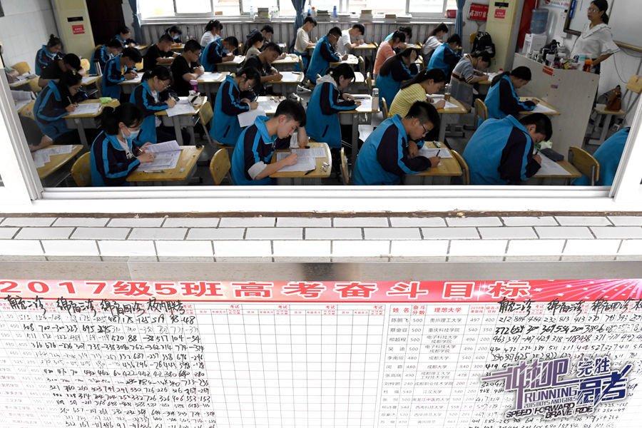 高考的脚步日益临近,高三学生正积极备战。6月9日,记者来到南充市嘉陵一中看到,25个班级外面写满了每个同学的理想大学,教室内正在参加模拟考试的高三学生专注地答题,只听见笔触纸的“莎莎”声,一种紧张的高考的气氛扑面而来。