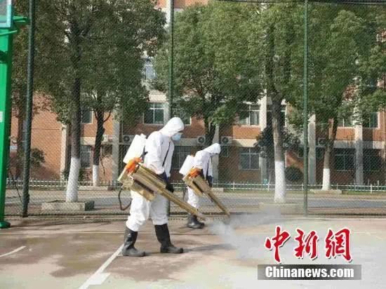 资料图:鄂州消防员对学校操场进行消杀。王涛 摄