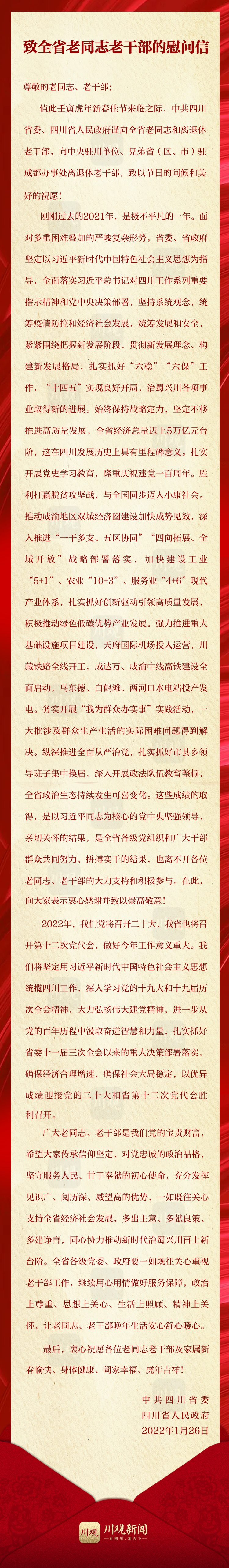 壬寅虎年新春佳节来临之际,中共四川省委、四川省人民政府发出慰问信,向全省老同志和离退休老干部,向中央驻川单位、兄弟省(区、市)驻成都办事处离退休老干部,致以节日的问候和美好的祝愿!衷心祝愿各位老同志老干部及家属新春愉快、身体健康、阖家幸福、虎年吉祥!